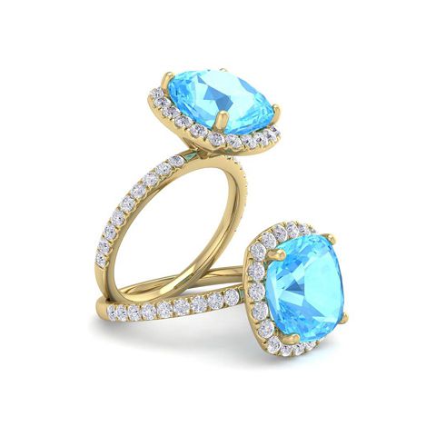 6 Carat Cushion Cut Blue Topaz and Diamond Ring In 14 Karat Yellow Gold