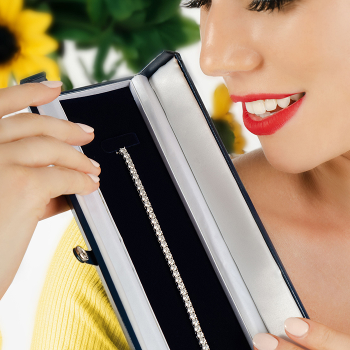 14 Karat White Gold 6 Carat Round Diamond Tennis Bracelet. The diamonds are SuperJeweler quality, J-K Color, I2 Clarity. The diamond tennis bracelet is the staple of a diamond bracelet and will either begin or complete her jewelry wardrobe. With 50 sparkling diamonds, this bracelet will get noticed.