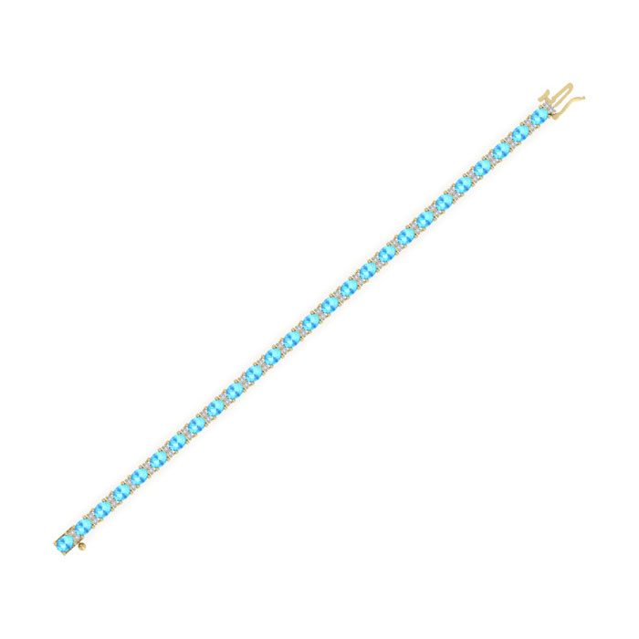 This gemstone bracelet features 26 oval shape 4x3mm blue topaz gemstones totaling approximately 5 3/4 carats. There are 52 round shape diamonds in I-J color, I2 clarity totaling approximately 1/2 carat. Total carat weight is 6 carats. This gemstone bracelet is in 14 karat yellow gold and is 7 inches long. It comes with a secure box with tongue and safety clasp.