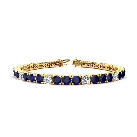 This classic gemstone bracelet features shimmering white diamonds in I-J color, I1-I2 clarity and sapphire gemstones. The 6 inch bracelet contains 39 gemstones and diamonds at 10.20 carats. The 6.5 inch bracelet contains 42 gemstones and diamonds at 11.24 carats. The 7 inch bracelet contains 45 gemstones and diamonds at 12 carats. The 7.5 inch bracelet contains 49 gemstones and diamonds at 12.76 carats. The 8 inch bracelet contains 53 gemstones and diamonds at 13.80 carats. The 8.5 inch bracelet contains 56 gemstones and diamonds at 14.56 carats. The 9 inch bracelet contains 59 gemstones and diamonds at 15.40 carats. This bracelet is approximately 3.8mm wide and is crafted in 14 karat yellow gold. This bracelet has a secure, box with tongue and safety clasp.