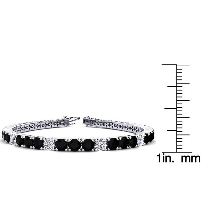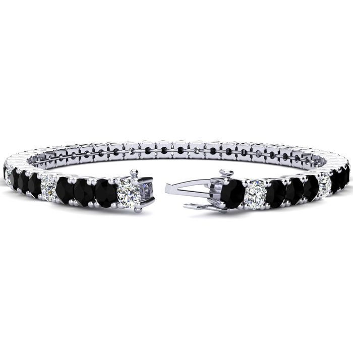 This classic gemstone bracelet features shimmering white diamonds in I-J color, I1-I2 clarity and black diamonds in I3 clarity. The 6 inch bracelet contains 39 black and white diamonds at 7.80 carats. The 6.5 inch bracelet contains 42 black and white diamonds at 8.60 carats. The 7 inch bracelet contains 45 black and white diamonds at 9.20 carats. The 7.5 inch bracelet contains 49 black and white diamonds at 9.80 carats. The 8 inch bracelet contains 53 black and white diamonds at 10.60 carats. The 8.5 inch bracelet contains 56 black and white diamonds at 11.20 carats. The 9 inch bracelet contains 59 black and white diamonds at 11.80 carats. This bracelet is approximately 3.8mm wide and is crafted in 14 karat white gold. This bracelet has a secure, box with tongue and safety clasp.