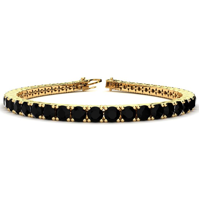 This classic gemstone bracelet features shimmering black diamonds in I3 clarity. The 6 inch bracelet contains 39 black diamonds at 7.80 carats. The 6.5 inch bracelet contains 42 black diamonds at 8.60 carats. The 7 inch bracelet contains 45 black diamonds at 9.20 carats. The 7.5 inch bracelet contains 49 black diamonds at 9.80 carats. The 8 inch bracelet contains 53 black diamonds at 10.60 carats. The 8.5 inch bracelet contains 56 black diamonds at 11.20 carats. The 9 inch bracelet contains 59 black diamonds at 11.80 carats. This bracelet is approximately 3.8mm wide and is crafted in 14 karat yellow gold. This bracelet has a secure, box with tongue and safety clasp.
