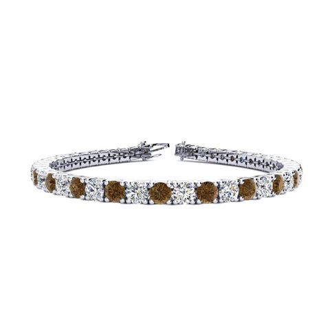 This classic gemstone bracelet features shimmering white diamonds in I-J color, I1-I2 clarity and chocolate bar brown champagne diamonds in I3 clarity. The 6 inch bracelet contains 39 chocolate bar brown champagne and white diamonds at 7.80 carats. The 6.5 inch bracelet contains 42 chocolate bar brown champagne and white diamonds at 8.60 carats. The 7 inch bracelet contains 45 chocolate bar brown champagne and white diamonds at 9.20 carats. The 7.5 inch bracelet contains 49 chocolate bar brown champagne and white diamonds at 9.80 carats. The 8 inch bracelet contains 53 chocolate bar brown champagne and white diamonds at 10.60 carats. The 8.5 inch bracelet contains 56 chocolate bar brown champagne and white diamonds at 11.20 carats. The 9 inch bracelet contains 59 chocolate bar brown champagne and white diamonds at 11.80 carats. This bracelet is approximately 3.8mm wide and is crafted in 14 karat white gold. This bracelet has a secure, box with tongue and safety clasp.