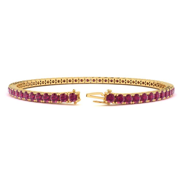 This classic ruby bracelet features shimmering ruby gemstones. The 6 inch bracelet contains 50 gemstones at 4.64 carats. The 6.5 inch bracelet contains 55 gemstones at 4.80 carats. The 7 inch bracelet contains 59 gemstones at 5.20 carats. The 7.5 inch bracelet contains 63 gemstones at 5.60 carats. The 8 inch bracelet contains 67 gemstones at 5.92 carats. The 8.5 inch bracelet contains 72 gemstones at 6.30 carats. The 9 inch bracelet contains 76 gemstones at 6.72 carats. This bracelet is approximately 2.5mm wide and is crafted in 14 karat yellow gold. This bracelet has a secure, box with tongue and safety clasp.