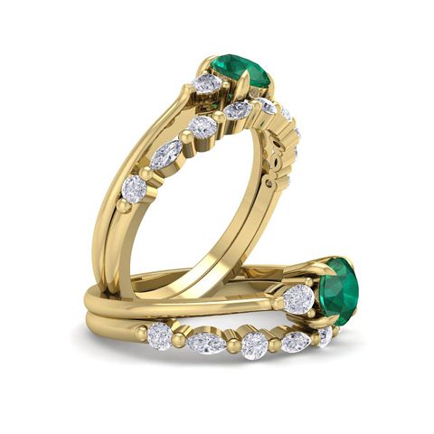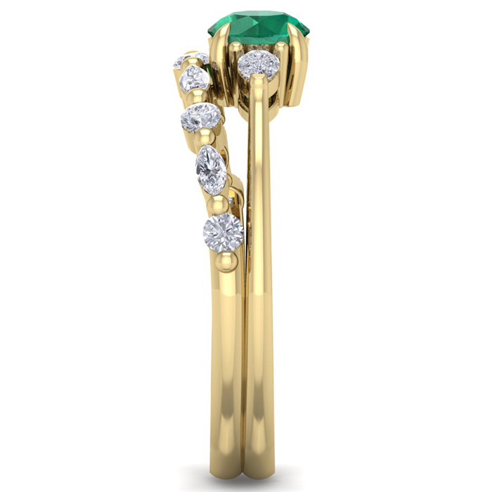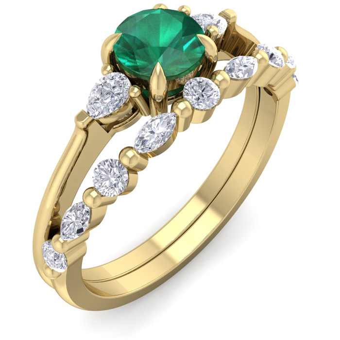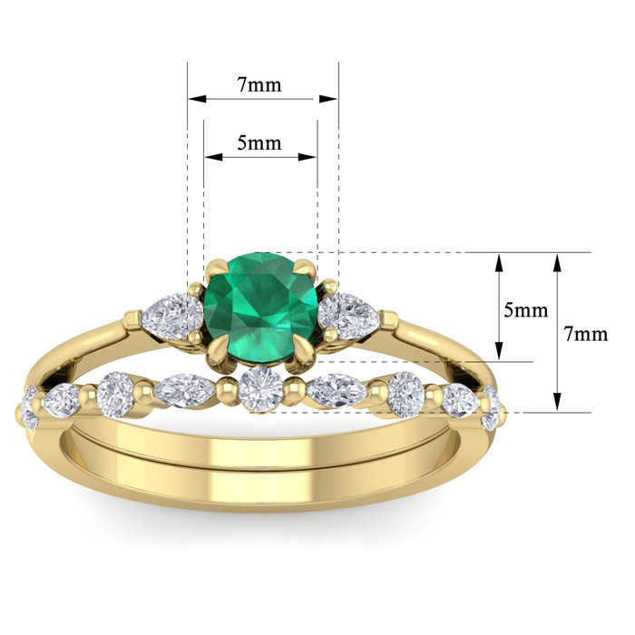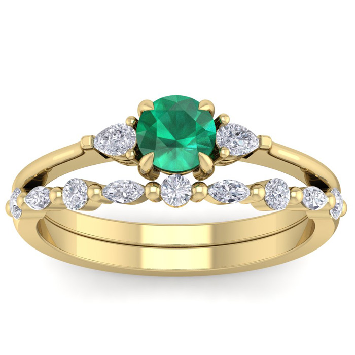 This elegant gemstone bridal set features one 5mm round shape emerald gemstone at approximately 0.50 carats. It is surrounded by 5 round, 4 marquise and 2 pear shape sparkling diamonds along the ring and matching band in I-J color, I1-I2 clarity at 1/3 carat total weight. Total gem weight is approximately 0.86 carat total weight. This ring is in 14 karat yellow gold.