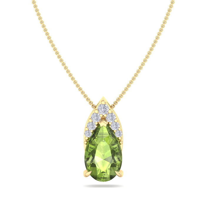 This gemstone necklace features 1 sparkling pear shape peridot gemstone weighing approximately 3/4 carats. It is surrounded with a crown of 7 diamonds totaling approximately 1/10 carat. Total carat weight is 7/8 carat. Diamond color is I-J, diamond clarity I1-I2. This necklace is in 14 karat yellow gold and comes with an 18 inch cable chain with a spring-ring clasp.