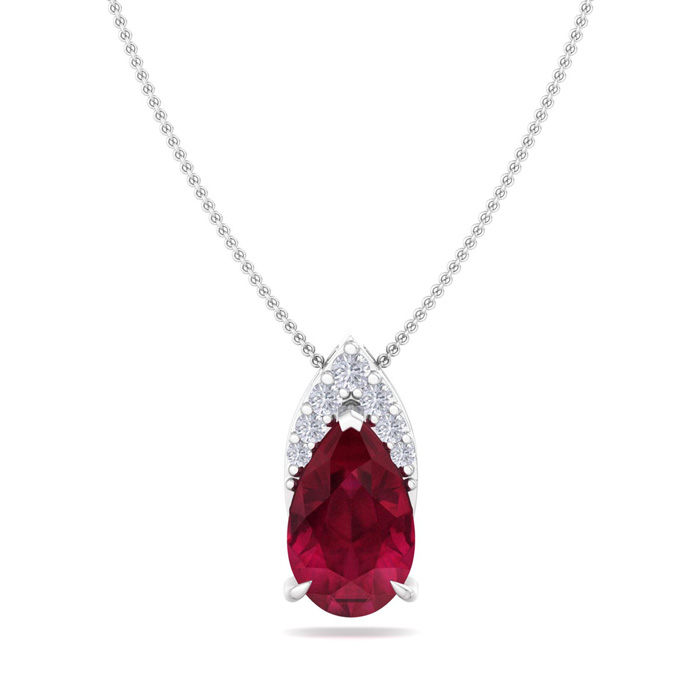 This gemstone necklace features 1 sparkling pear shape created ruby gemstone weighing approximately 3/4 carats. It is surrounded with a crown of 7 diamonds totaling approximately 1/10 carat. Total carat weight is 7/8 carat. Diamond color is I-J, diamond clarity I1-I2. This necklace is in 14 karat white gold and comes with an 18 inch cable chain with a spring-ring clasp.