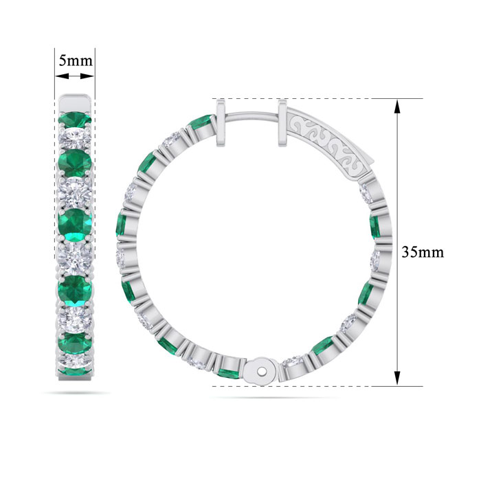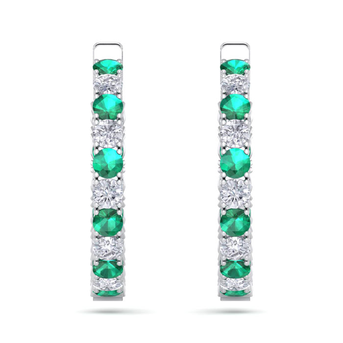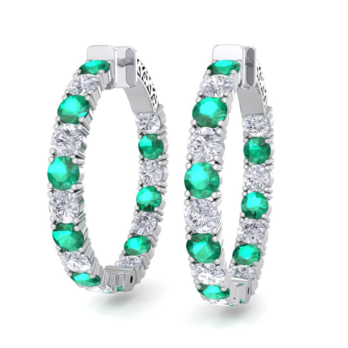 7 Carat Emerald and Diamond Hoop Earrings In 14 Karat White Gold, 1 1/4 Inch
