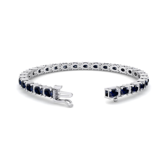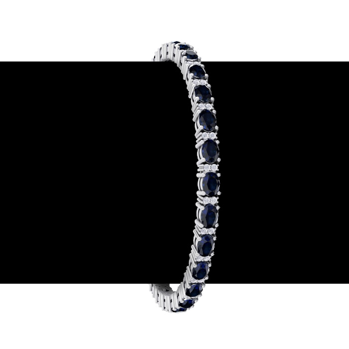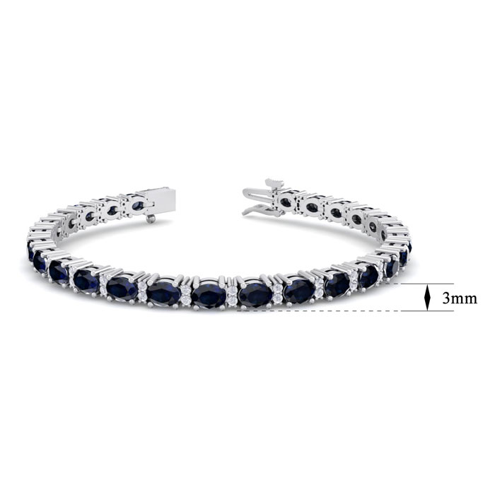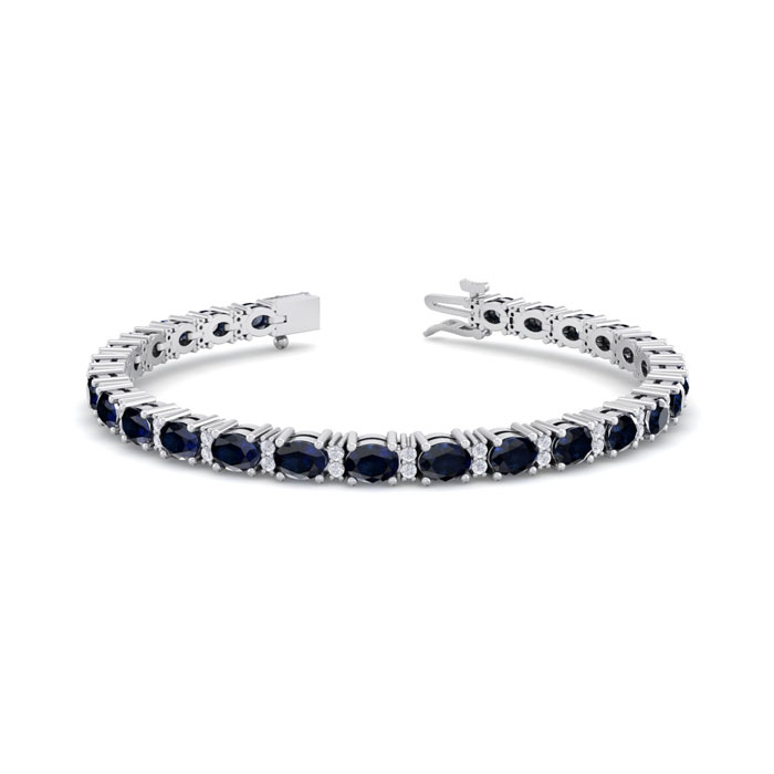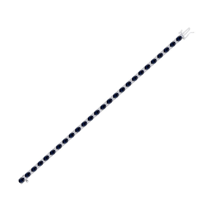This gemstone bracelet features 26 oval shape 4x3mm sapphire gemstones totaling approximately 6 1/2 carats. There are 52 round shape diamonds in I-J color, I2 clarity totaling approximately 1/2 carat. Total carat weight is 7 carats. This gemstone bracelet is in 14 karat white gold and is 7 inches long. It comes with a secure box with tongue and safety clasp.
