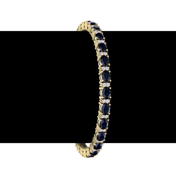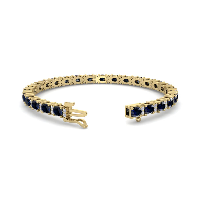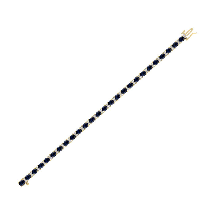 This gemstone bracelet features 26 oval shape 4x3mm sapphire gemstones totaling approximately 6 1/2 carats. There are 52 round shape diamonds in I-J color, I2 clarity totaling approximately 1/2 carat. Total carat weight is 7 carats. This gemstone bracelet is in 14 karat yellow gold and is 7 inches long. It comes with a secure box with tongue and safety clasp.