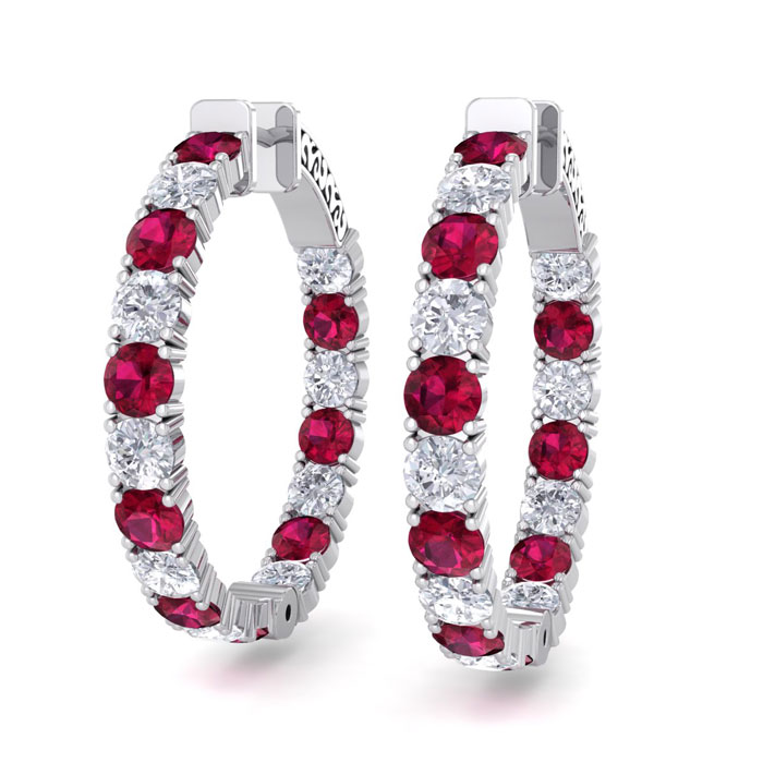 7 Carat Ruby and Diamond Hoop Earrings In 14 Karat White Gold, 1 1/4 Inch