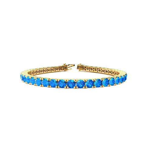 This classic gemstone bracelet features shimmering blue topaz gemstones. The 6 inch bracelet contains 39 gemstones at 9.75 carats. The 6.5 inch bracelet contains 42 gemstones at 10.75 carats. The 7 inch bracelet contains 45 gemstones at 11.50 carats. The 7.5 inch bracelet contains 49 gemstones at 12.25 carats. The 8 inch bracelet contains 53 gemstones at 13.25 carats. The 8.5 inch bracelet contains 56 gemstones at 14 carats. The 9 inch bracelet contains 59 gemstones at 14.75 carats. This bracelet is approximately 3.8mm wide and is crafted in 14 karat yellow gold. This bracelet has a secure, box with tongue and safety clasp.