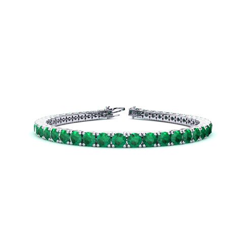This classic gemstone bracelet features shimmering emerald gemstones. The 6 inch bracelet contains 39 gemstones at 9.75 carats. The 6.5 inch bracelet contains 42 gemstones at 10.75 carats. The 7 inch bracelet contains 45 gemstones at 11.50 carats. The 7.5 inch bracelet contains 49 gemstones at 12.25 carats. The 8 inch bracelet contains 53 gemstones at 13.25 carats. The 8.5 inch bracelet contains 56 gemstones at 14 carats. The 9 inch bracelet contains 59 gemstones at 14.75 carats. This bracelet is approximately 3.8mm wide and is crafted in 14 karat white gold. This bracelet has a secure, box with tongue and safety clasp.