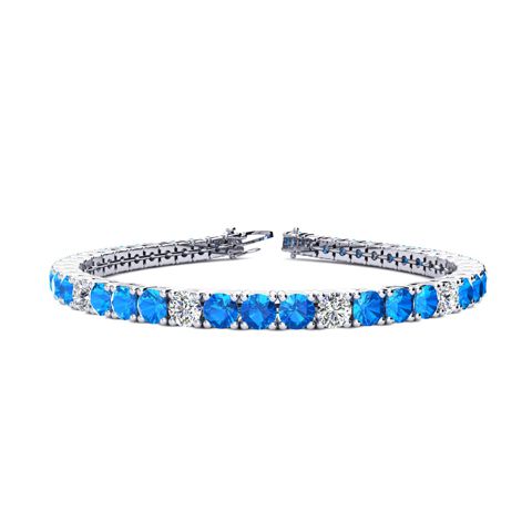 This classic gemstone bracelet features shimmering white diamonds in I-J color, I1-I2 clarity and blue topaz gemstones. The 6 inch bracelet contains 39 gemstones and diamonds at 9.30 carats. The 6.5 inch bracelet contains 42 gemstones and diamonds at 10.25 carats. The 7 inch bracelet contains 45 gemstones and diamonds at 10.95 carats. The 7.5 inch bracelet contains 49 gemstones and diamonds at 11.65 carats. The 8 inch bracelet contains 53 gemstones and diamonds at 12.60 carats. The 8.5 inch bracelet contains 56 gemstones and diamonds at 13.30 carats. The 9 inch bracelet contains 59 gemstones and diamonds at 14.05 carats. This bracelet is approximately 3.8mm wide and is crafted in 14 karat white gold. This bracelet has a secure, box with tongue and safety clasp.