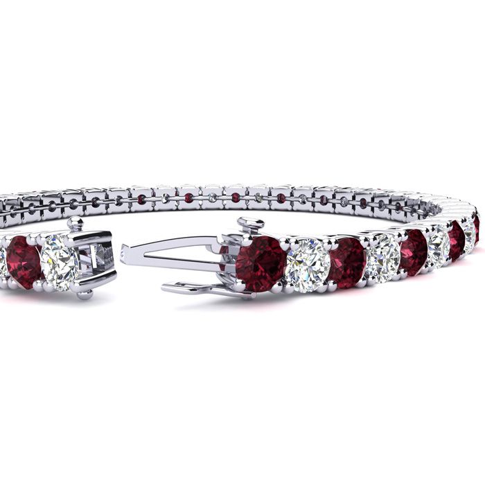 This classic gemstone bracelet features shimmering white diamonds in I-J color, I1-I2 clarity and garnet gemstones. The 6 inch bracelet contains 39 gemstones and diamonds at 8.18 carats. The 6.5 inch bracelet contains 42 gemstones and diamonds at 9.02 carats. The 7 inch bracelet contains 45 gemstones and diamonds at 9.66 carats. The 7.5 inch bracelet contains 49 gemstones and diamonds at 10.28 carats. The 8 inch bracelet contains 53 gemstones and diamonds at 11.12 carats. The 8.5 inch bracelet contains 56 gemstones and diamonds at 11.76 carats. The 9 inch bracelet contains 59 gemstones and diamonds at 12.38 carats. This bracelet is approximately 3.8mm wide and is crafted in 14 karat white gold. This bracelet has a secure, box with tongue and safety clasp.