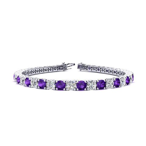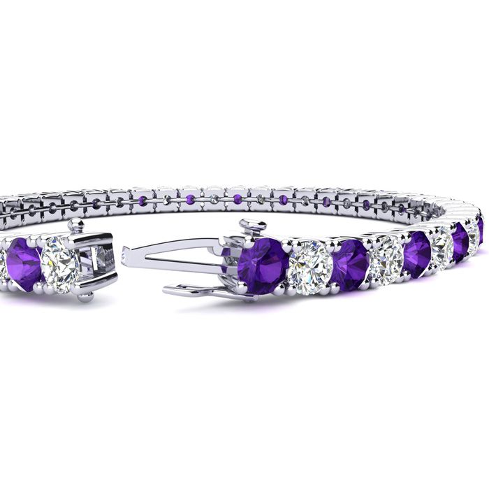 This classic gemstone bracelet features shimmering white diamonds in I-J color, I1-I2 clarity and amethyst gemstones. The 6 inch bracelet contains 39 gemstones and diamonds at 7.80 carats. The 6.5 inch bracelet contains 42 gemstones and diamonds at 8.60 carats. The 7 inch bracelet contains 45 gemstones and diamonds at 9.20 carats. The 7.5 inch bracelet contains 49 gemstones and diamonds at 9.80 carats. The 8 inch bracelet contains 53 gemstones and diamonds at 10.60 carats. The 8.5 inch bracelet contains 56 gemstones and diamonds at 11.20 carats. The 9 inch bracelet contains 59 gemstones and diamonds at 11.80 carats. This bracelet is approximately 3.8mm wide and is crafted in 14 karat white gold. This bracelet has a secure, box with tongue and safety clasp.