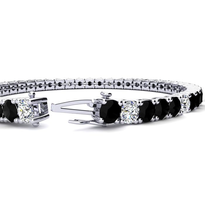 This classic gemstone bracelet features shimmering white diamonds in I-J color, I1-I2 clarity and black diamonds in I3 clarity. The 6 inch bracelet contains 39 black and white diamonds at 7.80 carats. The 6.5 inch bracelet contains 42 black and white diamonds at 8.60 carats. The 7 inch bracelet contains 45 black and white diamonds at 9.20 carats. The 7.5 inch bracelet contains 49 black and white diamonds at 9.80 carats. The 8 inch bracelet contains 53 black and white diamonds at 10.60 carats. The 8.5 inch bracelet contains 56 black and white diamonds at 11.20 carats. The 9 inch bracelet contains 59 black and white diamonds at 11.80 carats. This bracelet is approximately 3.8mm wide and is crafted in 14 karat white gold. This bracelet has a secure, box with tongue and safety clasp.
