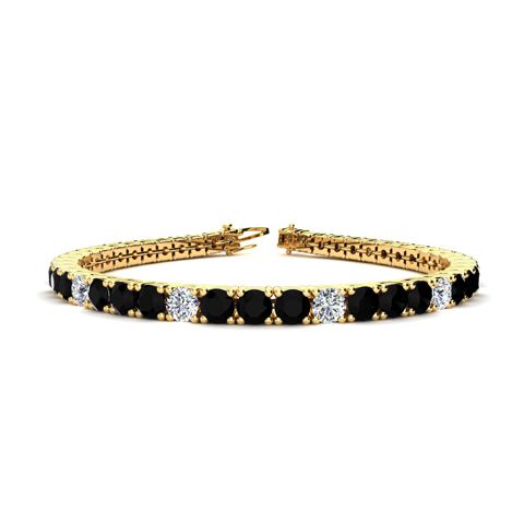 This classic gemstone bracelet features shimmering white diamonds in I-J color, I1-I2 clarity and black diamonds in I3 clarity. The 6 inch bracelet contains 39 black and white diamonds at 7.80 carats. The 6.5 inch bracelet contains 42 black and white diamonds at 8.60 carats. The 7 inch bracelet contains 45 black and white diamonds at 9.20 carats. The 7.5 inch bracelet contains 49 black and white diamonds at 9.80 carats. The 8 inch bracelet contains 53 black and white diamonds at 10.60 carats. The 8.5 inch bracelet contains 56 black and white diamonds at 11.20 carats. The 9 inch bracelet contains 59 black and white diamonds at 11.80 carats. This bracelet is approximately 3.8mm wide and is crafted in 14 karat yellow gold. This bracelet has a secure, box with tongue and safety clasp.