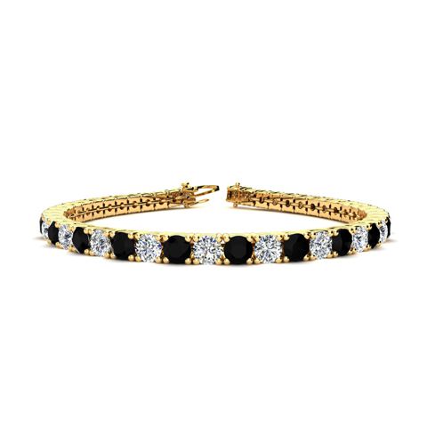 This classic gemstone bracelet features shimmering white diamonds in I-J color, I1-I2 clarity and black diamonds in I3 clarity. The 6 inch bracelet contains 39 black and white diamonds at 7.80 carats. The 6.5 inch bracelet contains 42 black and white diamonds at 8.60 carats. The 7 inch bracelet contains 45 black and white diamonds at 9.20 carats. The 7.5 inch bracelet contains 49 black and white diamonds at 9.80 carats. The 8 inch bracelet contains 53 black and white diamonds at 10.60 carats. The 8.5 inch bracelet contains 56 black and white diamonds at 11.20 carats. The 9 inch bracelet contains 59 black and white diamonds at 11.80 carats. This bracelet is approximately 3.8mm wide and is crafted in 14 karat yellow gold. This bracelet has a secure, box with tongue and safety clasp.