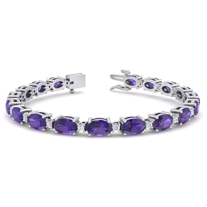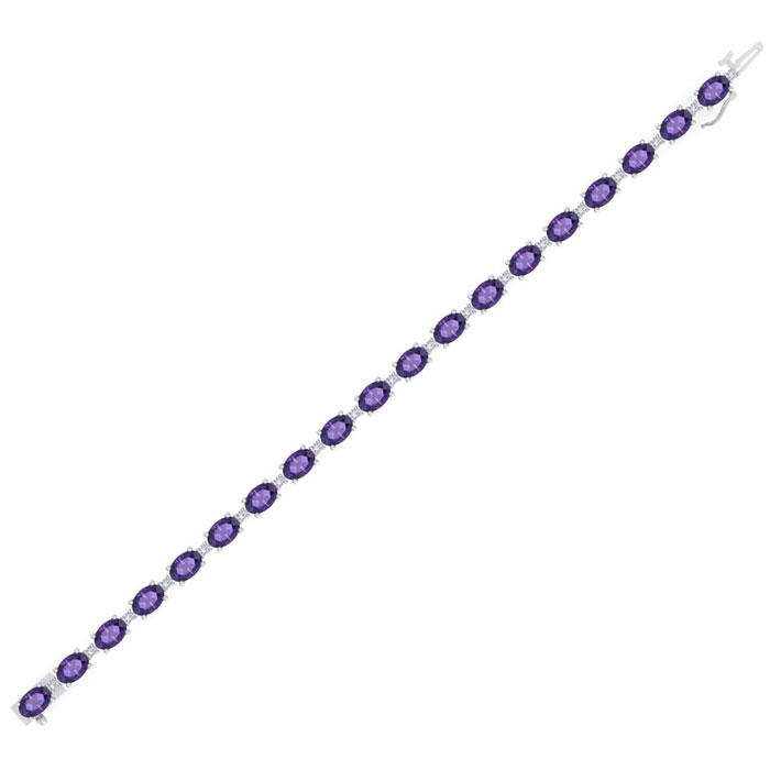 This gemstone bracelet features 19 oval shape 6x4mm amethyst gemstones totaling approximately 8 carats. There are 19 round shape diamonds in I-J color, I2 clarity totaling approximately 0.40 carats. Total carat weight is 8 1/2 carats. This gemstone bracelet is in 14 karat white gold and is 7 inches long. It comes with a secure box with tongue and safety clasp.