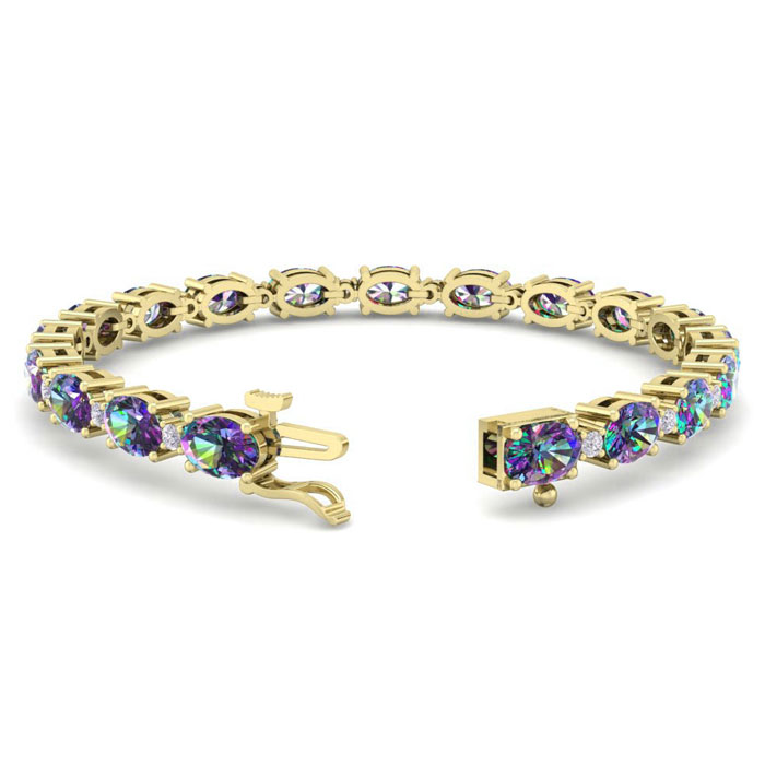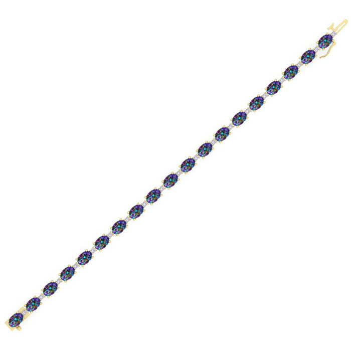 This gemstone bracelet features 19 oval shape 6x4mm mystic topaz gemstones totaling approximately 8 carats. There are 19 round shape diamonds in I-J color, I2 clarity totaling approximately 0.40 carats. Total carat weight is 8 1/2 carats. This gemstone bracelet is in 14 karat yellow gold and is 7 inches long. It comes with a secure box with tongue and safety clasp.