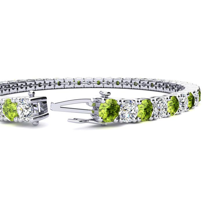 This classic gemstone bracelet features shimmering white diamonds in I-J color, I1-I2 clarity and peridot gemstones. The 6 inch bracelet contains 39 gemstones and diamonds at 7.80 carats. The 6.5 inch bracelet contains 42 gemstones and diamonds at 8.60 carats. The 7 inch bracelet contains 45 gemstones and diamonds at 9.20 carats. The 7.5 inch bracelet contains 49 gemstones and diamonds at 9.80 carats. The 8 inch bracelet contains 53 gemstones and diamonds at 10.60 carats. The 8.5 inch bracelet contains 56 gemstones and diamonds at 11.20 carats. The 9 inch bracelet contains 59 gemstones and diamonds at 11.80 carats. This bracelet is approximately 3.8mm wide and is crafted in 14 karat white gold. This bracelet has a secure, box with tongue and safety clasp.