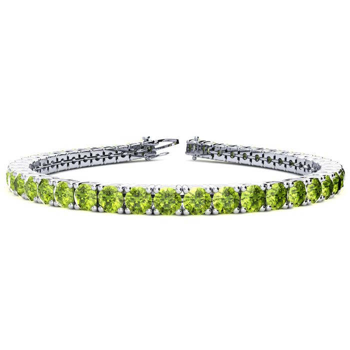 This classic gemstone bracelet features shimmering peridot gemstones. The 6 inch bracelet contains 39 gemstones at 7.80 carats. The 6.5 inch bracelet contains 42 gemstones at 8.60 carats. The 7 inch bracelet contains 45 gemstones at 9.20 carats. The 7.5 inch bracelet contains 49 gemstones at 9.80 carats. The 8 inch bracelet contains 53 gemstones at 10.60 carats. The 8.5 inch bracelet contains 56 gemstones at 11.20 carats. The 9 inch bracelet contains 59 gemstones at 11.80 carats. This bracelet is approximately 3.8mm wide and is crafted in 14 karat white gold. This bracelet has a secure, box with tongue and safety clasp.