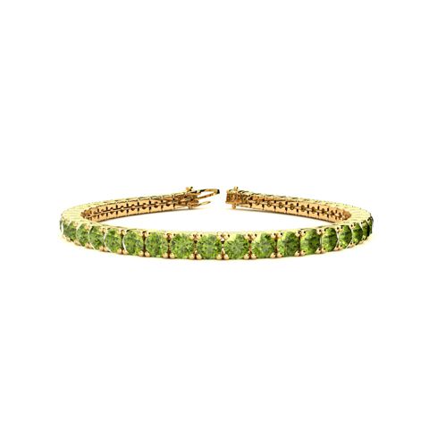 This classic gemstone bracelet features shimmering peridot gemstones. The 6 inch bracelet contains 39 gemstones at 7.80 carats. The 6.5 inch bracelet contains 42 gemstones at 8.60 carats. The 7 inch bracelet contains 45 gemstones at 9.20 carats. The 7.5 inch bracelet contains 49 gemstones at 9.80 carats. The 8 inch bracelet contains 53 gemstones at 10.60 carats. The 8.5 inch bracelet contains 56 gemstones at 11.20 carats. The 9 inch bracelet contains 59 gemstones at 11.80 carats. This bracelet is approximately 3.8mm wide and is crafted in 14 karat yellow gold. This bracelet has a secure, box with tongue and safety clasp.