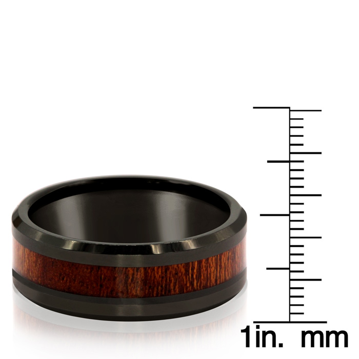 I bought this ring for my boyfriend as a birthday gift. I was unsure if he would like it as it has a reflective clear coat on it. He absolutely loves it! It is good, sturdy material, with well inlaid koa wood. The wood is a little reflective in the light which carches the eye nicely. The ring is not super flashy, which is what my boyfriend was looking for, that and black or wood for the ring material. The engraving is free and very neat, with several fonts to choose from. Once you write out what you want engraved you are actually able to view the inscription in the photos of the ring. This was extremely helpful in picking my font as I am a little indecisive. I am very glad I found the ring and it was on sale for a very good price. Definitely would recommend. --Laura Wold.
