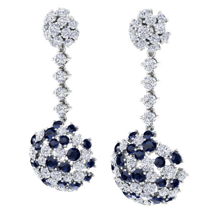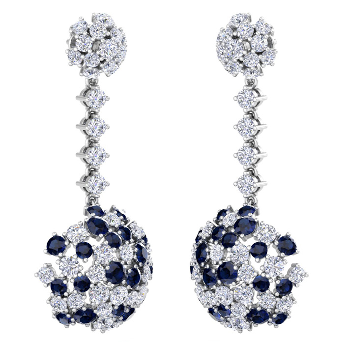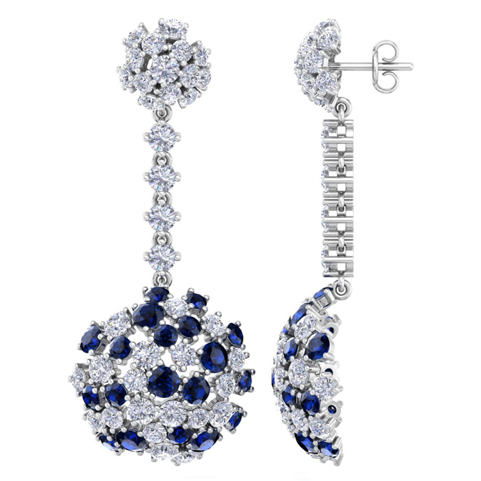 These lab grown diamond earrings feature 90 sparkling round shape lab grown diamonds and 22 sapphire gemstones totaling 9 1/2 carats. Diamond color is G-H, diamond clarity VS. These earrings are in 14 karat white gold and have comfortable and secure post with friction backs. The earrings drop down 2 Inches!