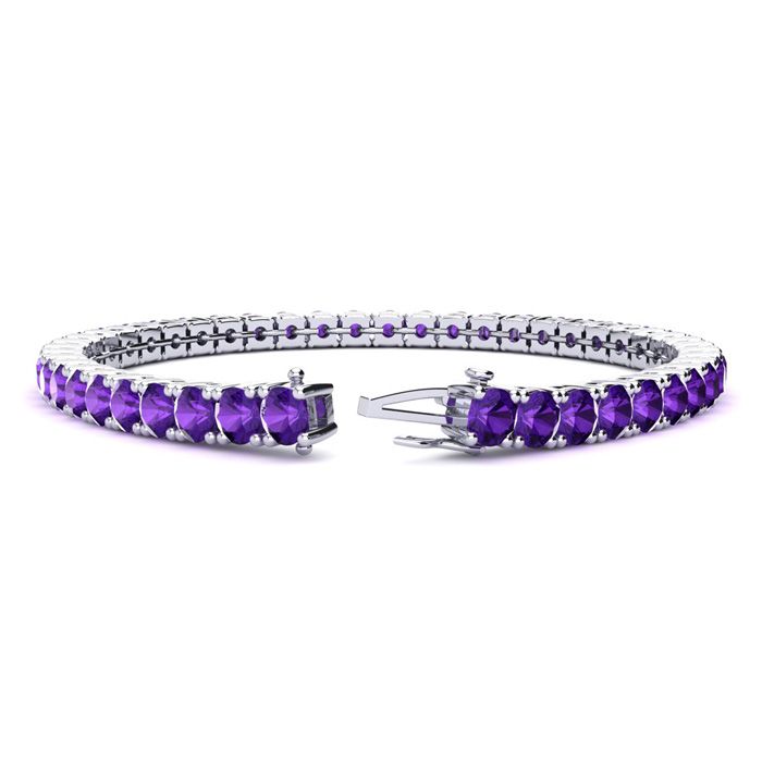 This classic gemstone bracelet features shimmering amethyst gemstones. The 6 inch bracelet contains 39 gemstones at 7.80 carats. The 6.5 inch bracelet contains 42 gemstones at 8.60 carats. The 7 inch bracelet contains 45 gemstones at 9.20 carats. The 7.5 inch bracelet contains 49 gemstones at 9.80 carats. The 8 inch bracelet contains 53 gemstones at 10.60 carats. The 8.5 inch bracelet contains 56 gemstones at 11.20 carats. The 9 inch bracelet contains 59 gemstones at 11.80 carats. This bracelet is approximately 3.8mm wide and is crafted in 14 karat white gold. This bracelet has a secure, box with tongue and safety clasp.