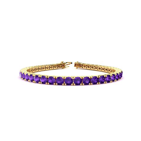 This classic gemstone bracelet features shimmering amethyst gemstones. The 6 inch bracelet contains 39 gemstones at 7.80 carats. The 6.5 inch bracelet contains 42 gemstones at 8.60 carats. The 7 inch bracelet contains 45 gemstones at 9.20 carats. The 7.5 inch bracelet contains 49 gemstones at 9.80 carats. The 8 inch bracelet contains 53 gemstones at 10.60 carats. The 8.5 inch bracelet contains 56 gemstones at 11.20 carats. The 9 inch bracelet contains 59 gemstones at 11.80 carats. This bracelet is approximately 3.8mm wide and is crafted in 14 karat yellow gold. This bracelet has a secure, box with tongue and safety clasp.