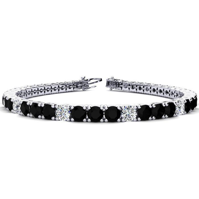 This classic gemstone bracelet features shimmering white diamonds in I-J color, I1-I2 clarity and black diamonds in I3 clarity. The 6 inch bracelet contains 39 black and white diamonds at 7.80 carats. The 6.5 inch bracelet contains 42 black and white diamonds at 8.60 carats. The 7 inch bracelet contains 45 black and white diamonds at 9.20 carats. The 7.5 inch bracelet contains 49 black and white diamonds at 9.80 carats. The 8 inch bracelet contains 53 black and white diamonds at 10.60 carats. The 8.5 inch bracelet contains 56 black and white diamonds at 11.20 carats. The 9 inch bracelet contains 59 black and white diamonds at 11.80 carats. This bracelet is approximately 3.8mm wide and is crafted in 14 karat white gold. This bracelet has a secure, box with tongue and safety clasp.