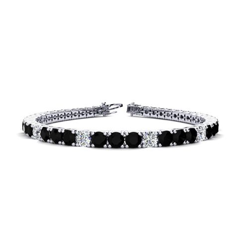 This classic gemstone bracelet features shimmering white diamonds in I-J color, I1-I2 clarity and black diamonds in I3 clarity. The 6 inch bracelet contains 39 black and white diamonds at 7.80 carats. The 6.5 inch bracelet contains 42 black and white diamonds at 8.60 carats. The 7 inch bracelet contains 45 black and white diamonds at 9.20 carats. The 7.5 inch bracelet contains 49 black and white diamonds at 9.80 carats. The 8 inch bracelet contains 53 black and white diamonds at 10.60 carats. The 8.5 inch bracelet contains 56 black and white diamonds at 11.20 carats. The 9 inch bracelet contains 59 black and white diamonds at 11.80 carats. This bracelet is approximately 3.8mm wide and is crafted in 14 karat white gold. This bracelet has a secure, box with tongue and safety clasp.