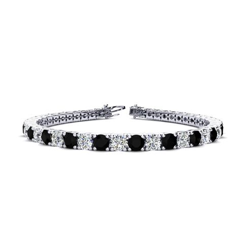 This classic gemstone bracelet features shimmering white diamonds in I-J color, I1-I2 clarity and black diamonds in I3 clarity. The 6 inch bracelet contains 39 black and white diamonds at 7.80 carats. The 6.5 inch bracelet contains 42 black and white diamonds at 8.60 carats. The 7 inch bracelet contains 45 black and white diamonds at 9.20 carats. The 7.5 inch bracelet contains 49 black and white diamonds at 9.80 carats. The 8 inch bracelet contains 53 black and white diamonds at 10.60 carats. The 8.5 inch bracelet contains 56 black and white diamonds at 11.20 carats. The 9 inch bracelet contains 59 black and white diamonds at 11.80 carats. This bracelet is approximately 3.8mm wide and is crafted in 14 karat white gold. This bracelet has a secure, box with tongue and safety clasp.