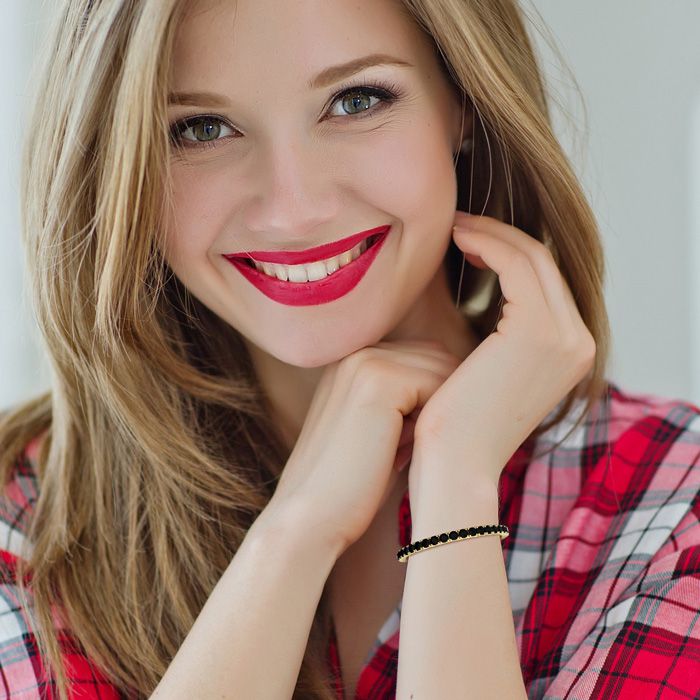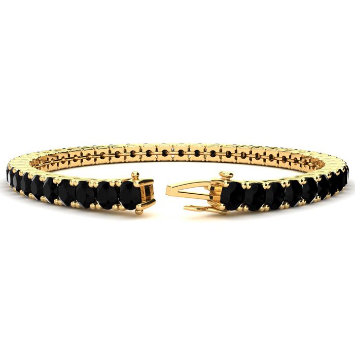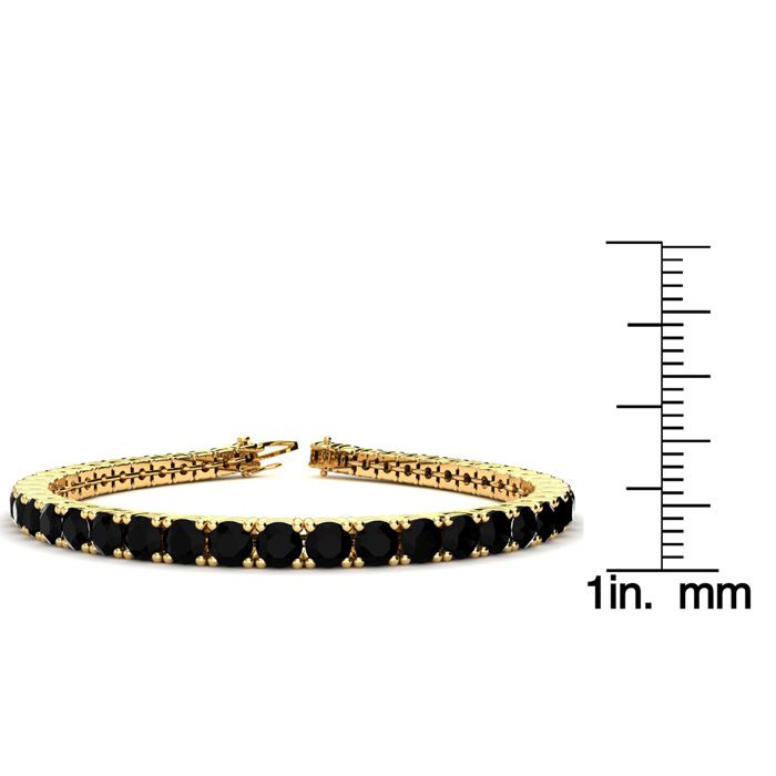 This classic gemstone bracelet features shimmering black diamonds in I3 clarity. The 6 inch bracelet contains 39 black diamonds at 7.80 carats. The 6.5 inch bracelet contains 42 black diamonds at 8.60 carats. The 7 inch bracelet contains 45 black diamonds at 9.20 carats. The 7.5 inch bracelet contains 49 black diamonds at 9.80 carats. The 8 inch bracelet contains 53 black diamonds at 10.60 carats. The 8.5 inch bracelet contains 56 black diamonds at 11.20 carats. The 9 inch bracelet contains 59 black diamonds at 11.80 carats. This bracelet is approximately 3.8mm wide and is crafted in 14 karat yellow gold. This bracelet has a secure, box with tongue and safety clasp.