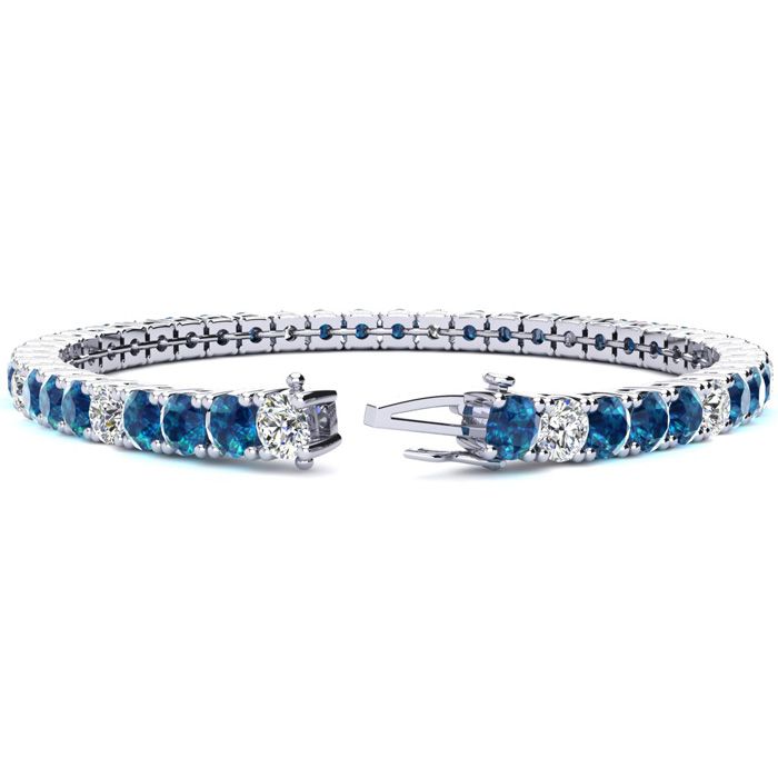 This classic gemstone bracelet features shimmering white diamonds in I-J color, I1-I2 clarity and blue diamonds in I3 clarity. The 6 inch bracelet contains 39 blue and white diamonds at 7.80 carats. The 6.5 inch bracelet contains 42 blue and white diamonds at 8.60 carats. The 7 inch bracelet contains 45 blue and white diamonds at 9.20 carats. The 7.5 inch bracelet contains 49 blue and white diamonds at 9.80 carats. The 8 inch bracelet contains 53 blue and white diamonds at 10.60 carats. The 8.5 inch bracelet contains 56 blue and white diamonds at 11.20 carats. The 9 inch bracelet contains 59 blue and white diamonds at 11.80 carats. This bracelet is approximately 3.8mm wide and is crafted in 14 karat white gold. This bracelet has a secure, box with tongue and safety clasp.