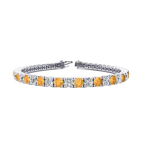 This classic gemstone bracelet features shimmering white diamonds in I-J color, I1-I2 clarity and citrine gemstones. The 6 inch bracelet contains 39 gemstones and diamonds at 7.80 carats. The 6.5 inch bracelet contains 42 gemstones and diamonds at 8.60 carats. The 7 inch bracelet contains 45 gemstones and diamonds at 9.20 carats. The 7.5 inch bracelet contains 49 gemstones and diamonds at 9.80 carats. The 8 inch bracelet contains 53 gemstones and diamonds at 10.60 carats. The 8.5 inch bracelet contains 56 gemstones and diamonds at 11.20 carats. The 9 inch bracelet contains 59 gemstones and diamonds at 11.80 carats. This bracelet is approximately 3.8mm wide and is crafted in 14 karat white gold. This bracelet has a secure, box with tongue and safety clasp.