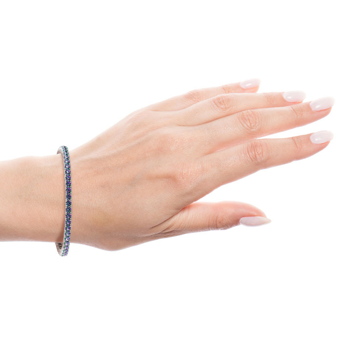 This classic gemstone bracelet features shimmering mystic topaz gemstones. The 6 inch bracelet contains 39 gemstones at 9.75 carats. The 6.5 inch bracelet contains 42 gemstones at 10.75 carats. The 7 inch bracelet contains 45 gemstones at 11.50 carats. The 7.5 inch bracelet contains 49 gemstones at 12.25 carats. The 8 inch bracelet contains 53 gemstones at 13.25 carats. The 8.5 inch bracelet contains 56 gemstones at 14 carats. The 9 inch bracelet contains 59 gemstones at 14.75 carats. This bracelet is approximately 3.8mm wide and is crafted in 14 karat white gold. This bracelet has a secure, box with tongue and safety clasp.