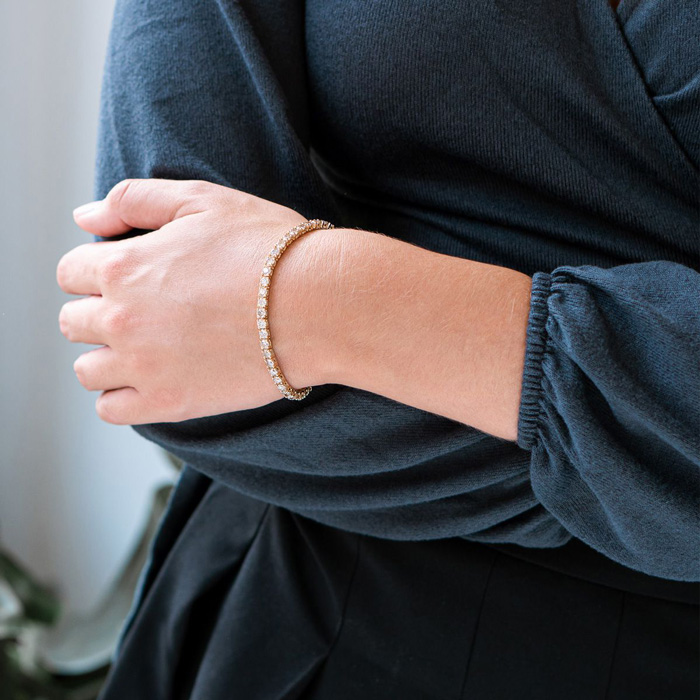 This tennis bracelet looks amazing! The yellow gold makes the diamonds look whiter and beautiful against any skin tone. The clasp is very secure and the diamonds sparkle no matter which angle you're looking at them from!