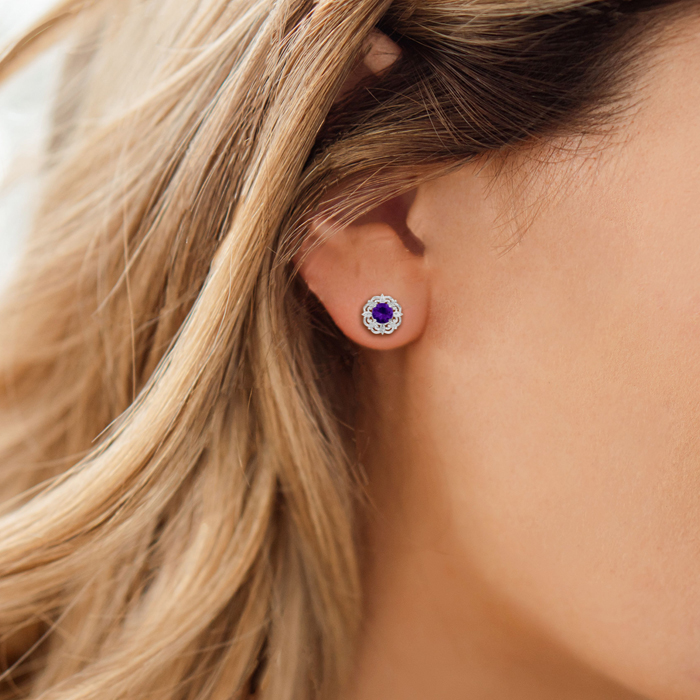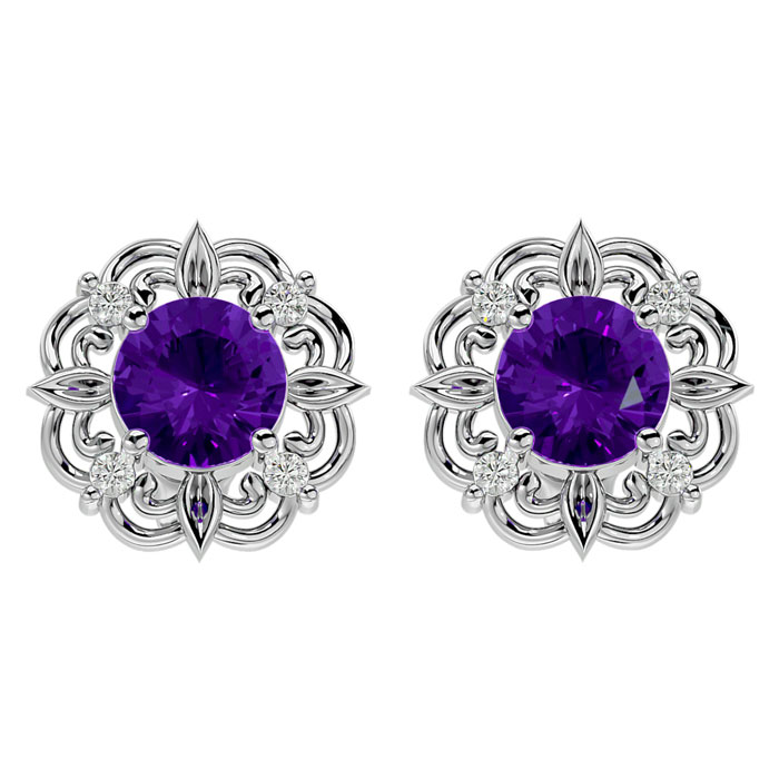 These stunning amethyst earrings features two round shape 6x6mm amethyst gemstones each weighing approximately 1 carat. It is surrounded by 8 sparkling diamonds in I-J color, I1-I2 clarity at 1/10 carat. Total carat weight is 2.10 carats. These earrings are crafted in sterling silver and have comfortable and secure post with friction backs.