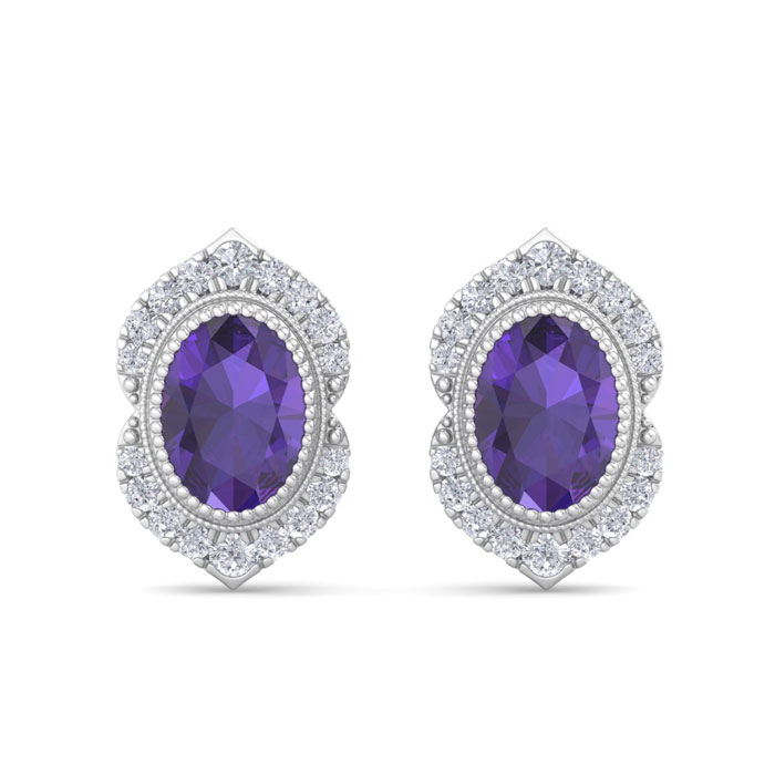 Retrograde Birthstones™ 2 Carat Oval Shape Amethyst and Diamond Earrings In 14K White Gold