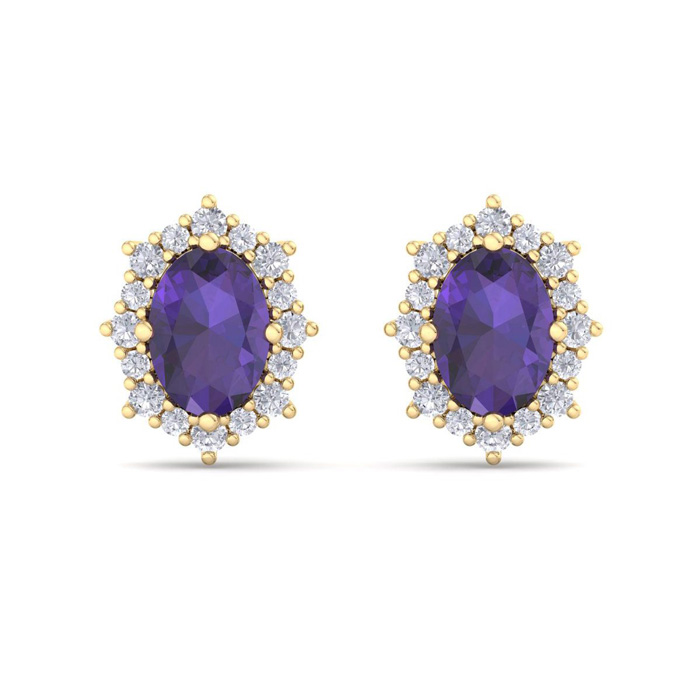 Retrograde Birthstones™ 2 Carat Oval Shape Amethyst and Diamond Earrings In 14K Yellow Gold