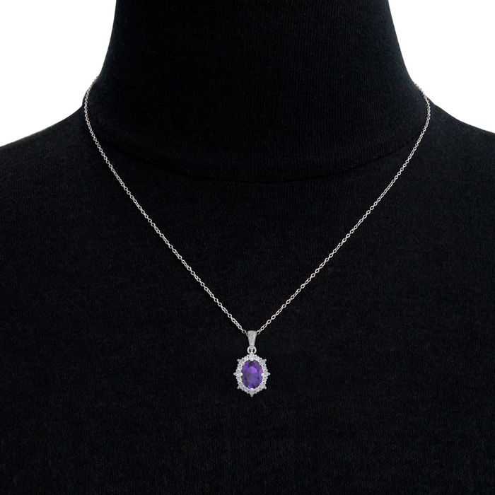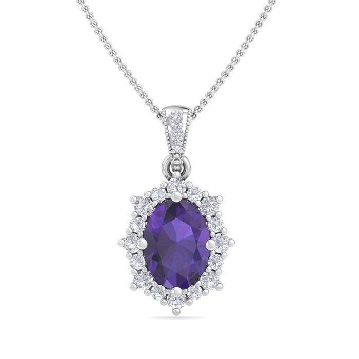 Retrograde Birthstones™ 1 1/3 Carat Oval Shape Amethyst and Diamond Necklace In 14K White Gold