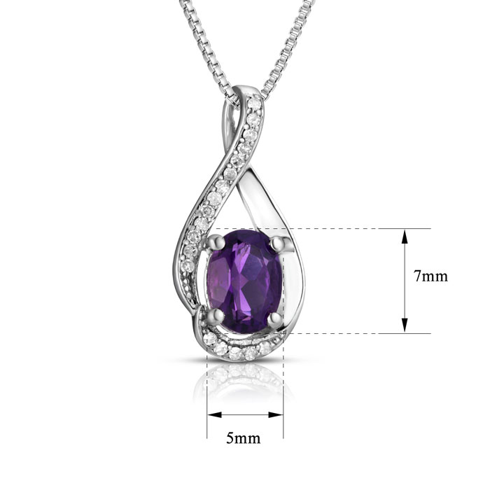 This stunning amethyst necklace features one 7x5mm oval shape amethyst gemstone weighing approximately 1 carat. It is surrounded by 18 sparkling diamonds in H-I color, I2-I3 clarity at 0.08 carats. Total carat weight is approximately 1.08 carats. This necklace is crafted in sterling silver and comes with an 18 inch box chain with spring ring clasp.