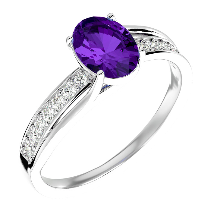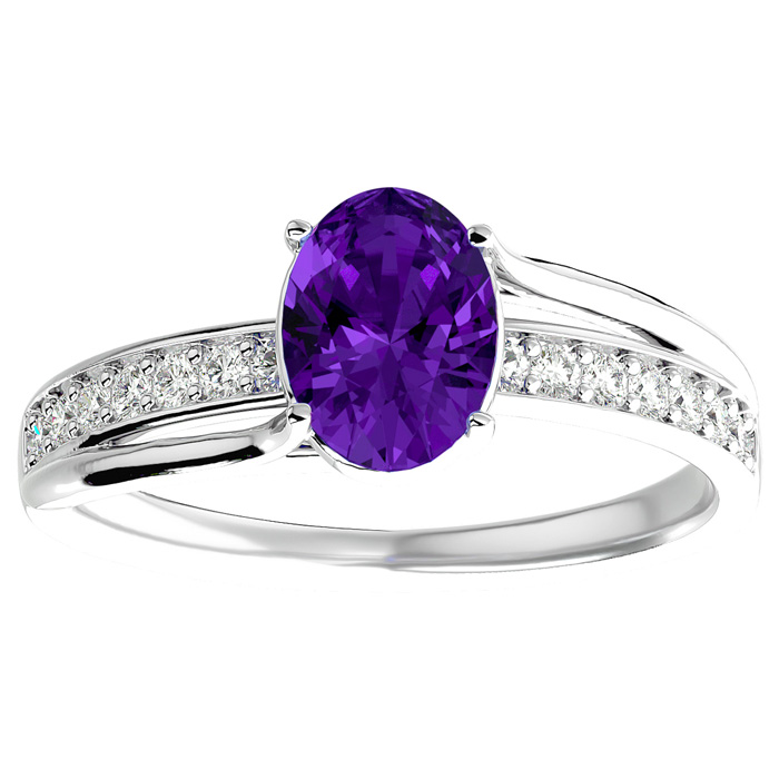 This amethyst ring features one 8x6mm oval shape amethyst gemstone. It is surrounded by 14 sparkling diamonds totaling 1/5 carat in I-J color, I1-I2 clarity. Total carat weight is approximately 1 1/2 carats. This ring is in sterling silver.