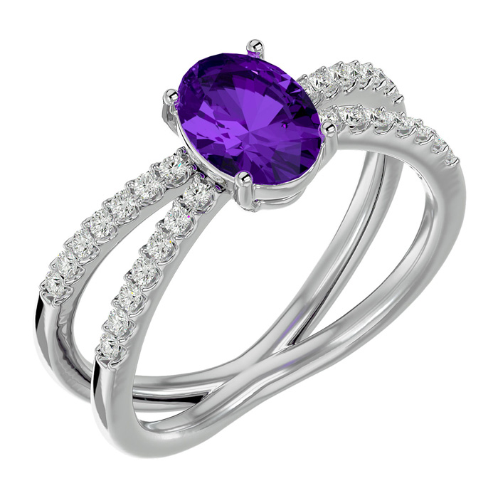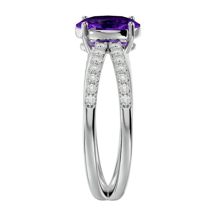 This amethyst ring features one 8x6mm oval shape amethyst gemstone. It is surrounded by 28 sparkling diamonds totaling 1/4 carat in I-J color, I1-I2 clarity. Total carat weight is approximately 1 1/2 carats. This ring is in sterling silver.