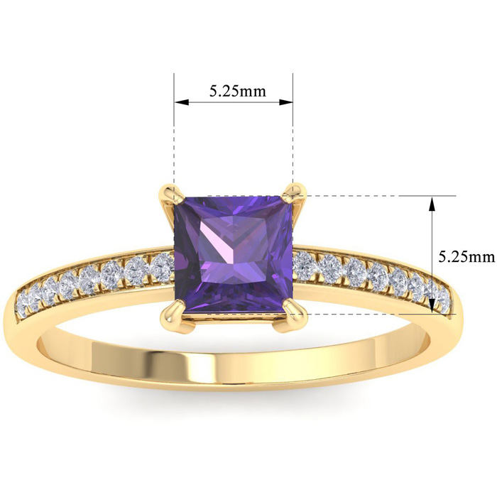 This gemstone ring features one 5.25mm princess shape amethyst gemstone weighing approximately 1 carat. There are 16 sparkling round diamonds in I-J color, I1-I2 clarity totaling approximately 1/4 carat. Total carat weight is 1 carat. This ring is in 14 karat yellow gold.