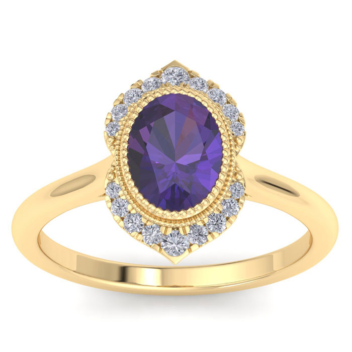 This gemstone ring features one 8x6mm oval shape amethyst gemstone weighing approximately 1 carat. There are 18 sparkling diamonds in I-J color, I1-I2 clarity totaling approximately 1/5 carat. Total carat weight is 1 1/5 carats. This ring is in 14 karat yellow gold.