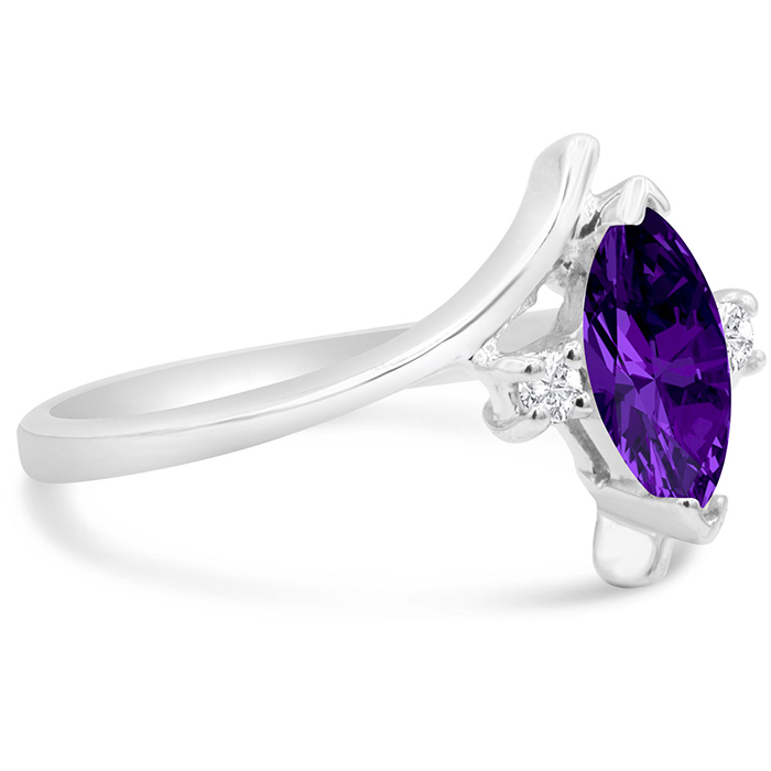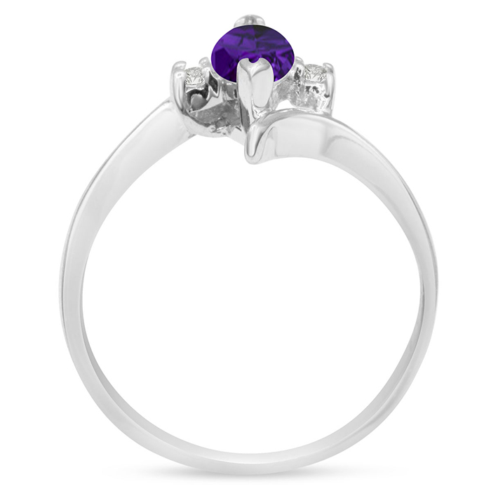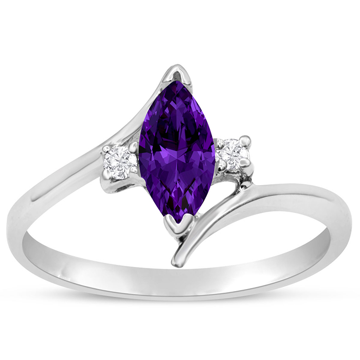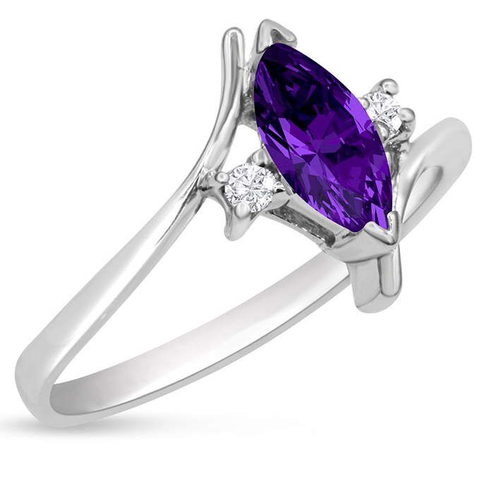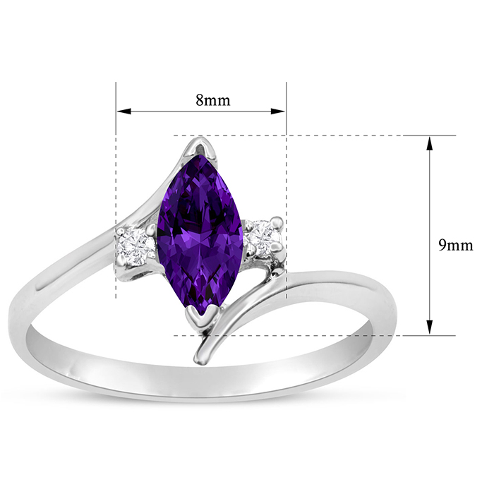 This amethyst ring features one 8x4mm marquise shape amethyst gemstone. It is surrounded by 2 sparkling diamonds totaling 0.05 carats in I-J color, I1-I2 clarity. Total carat weight is approximately 1/2 carat. This ring is in sterling silver.